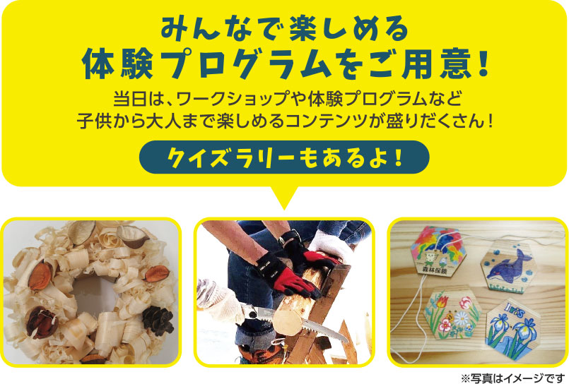 ・木工教室、寄せ植え教室、ネイチャーゲーム、木工品展示販売、自由工作塾、たね団子を作ろう、森の安全作業を学ぼう、空から森を眺めよう、その他販売・展示