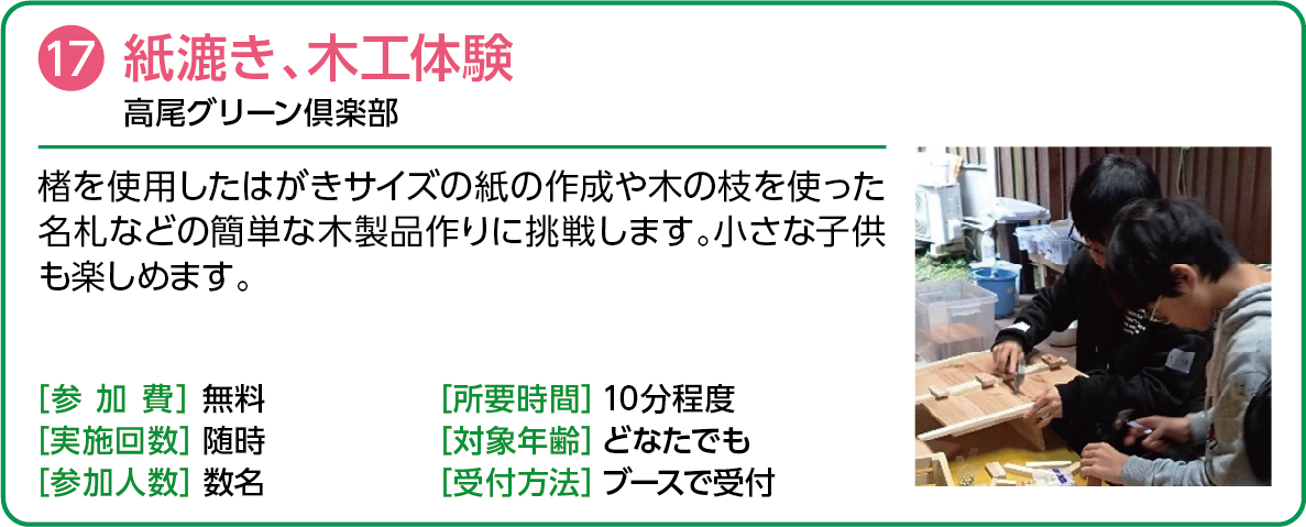 ・木工教室、寄せ植え教室、ネイチャーゲーム、木工品展示販売、自由工作塾、たね団子を作ろう、森の安全作業を学ぼう、空から森を眺めよう、その他販売・展示
